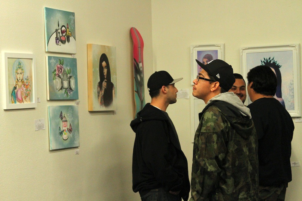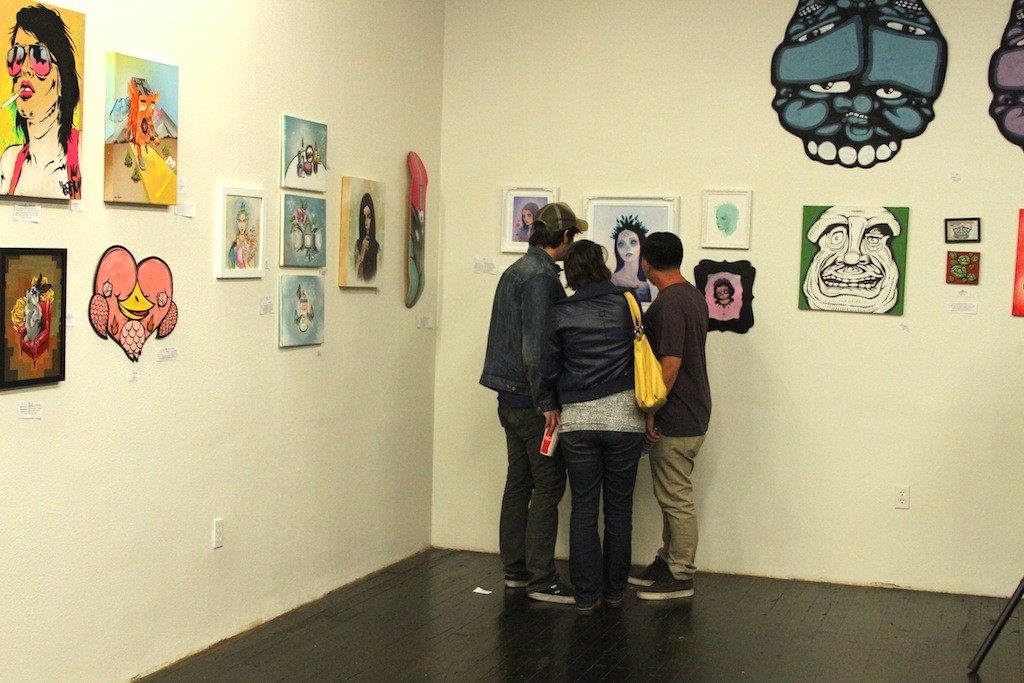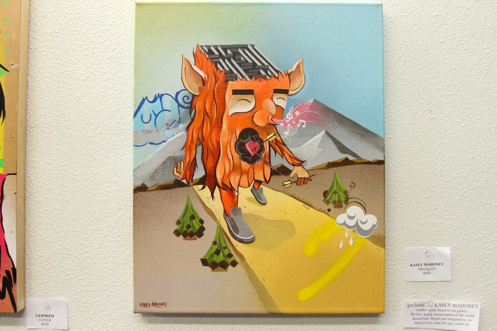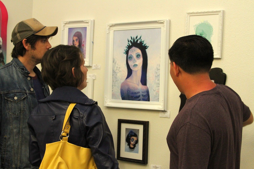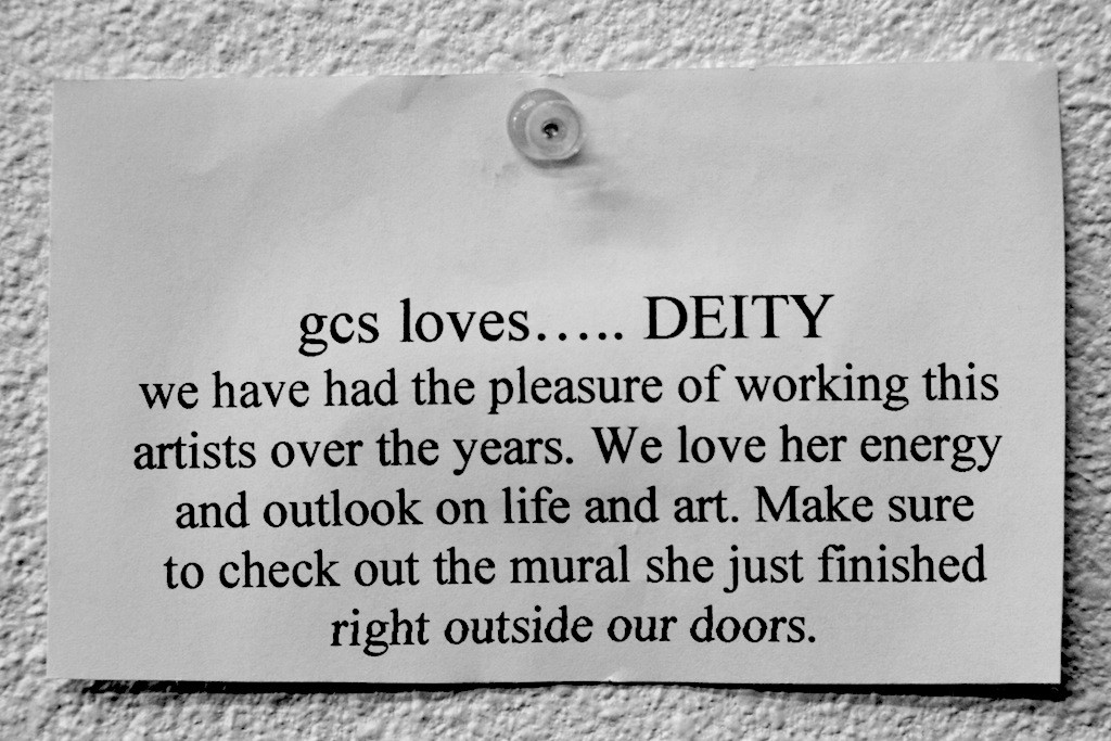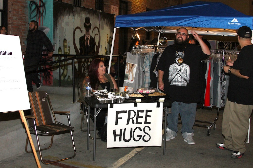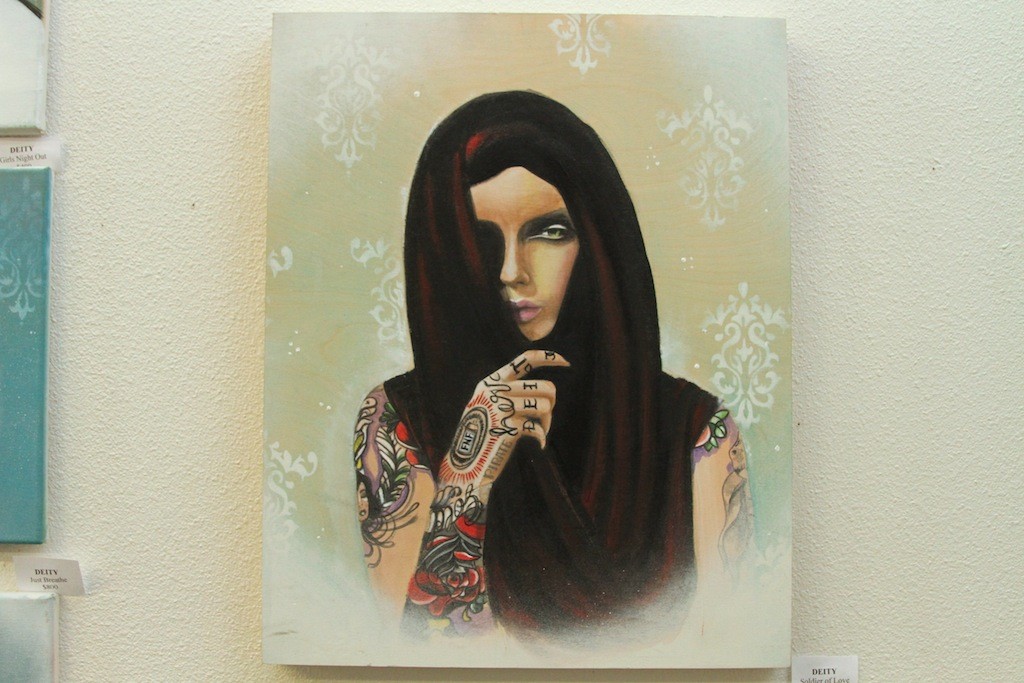FEB 7th, 2015… GCS was happy to host the second edition of the “All Our Love” art show that takes place during february’s art walk. This specially selected group of artists represented some of what GCS loves and holds most dear. We thank all the artists that were involved in the show as well as the crowds that came in though out the night. Big thanks to Scarub from Living Legends for his in store performance, which we covered in a previous post. DJ’s Real and AB were on the decks all night long. DJ AB had a HUG STATION out in front of the shop for the night promoting peace in the hood. And DEITY and Kimberly Duran finished up their latest pieces steps away from our front door.
