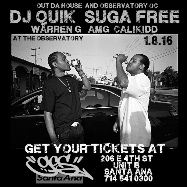 Events, News DJ QUIK, SUGA FREE and others JAN 8 January 5, 2016 Killergreen Leave a comment GCS has your ticket to see DJ QUIK, SUGA FREE, WARREN G, AMG, many others JAN 8th, 2016 at The Observatory OC. Call us for more info. 714 541 0300.