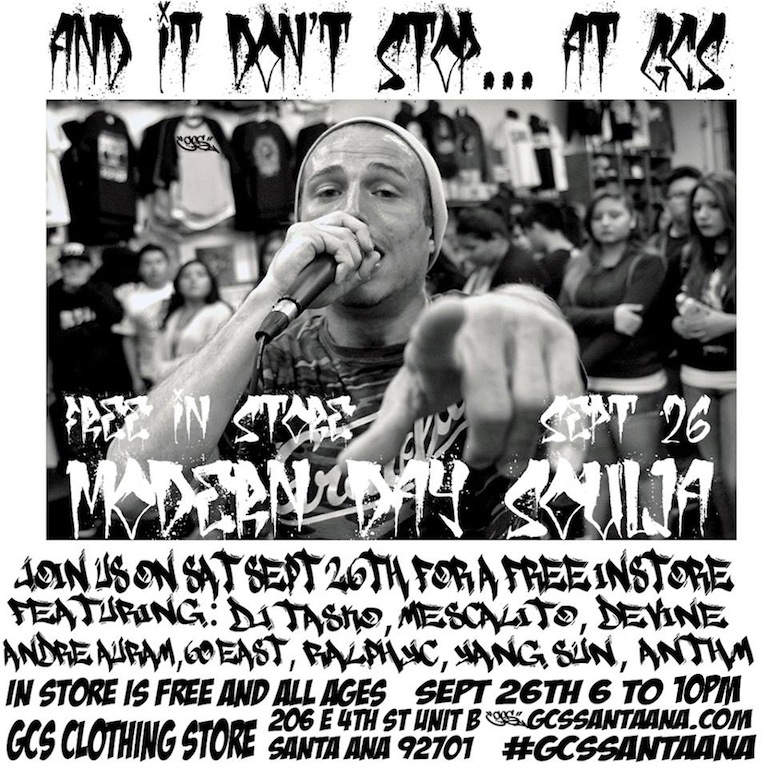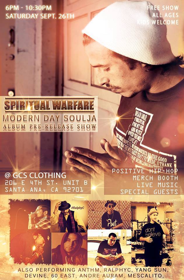 modernSeptember 26, 2015- Join us at GCS Clothing Store and Art Gallery on Sept 26 for his “Spiritual Warfare” Album Pre-Release Show. Also performing that night : Anthm, Ralphyc, Yang Sun, Devine, 60 East, Andre Auram, and Mescalito. Come out and suppot underground hip hop. Show starts at 6pm and goes until 10:30pm.. free and all ages!modernda