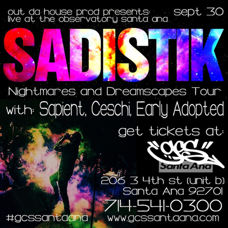 Events, News Sadistik at The Observatory sept 30 September 25, 2015 Killergreen Leave a comment GCS Clothing Store in Santa Ana is selling tickets to Sadistik’s SEPT 30th show at The Observatory. This is the OC date for the “Nightmares and Dreamscapes” TOUR with Sapient, Ceschi and Early Adopted. All ages.