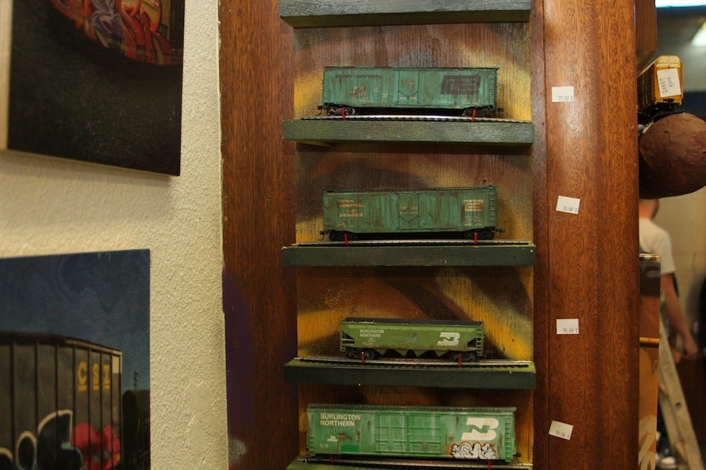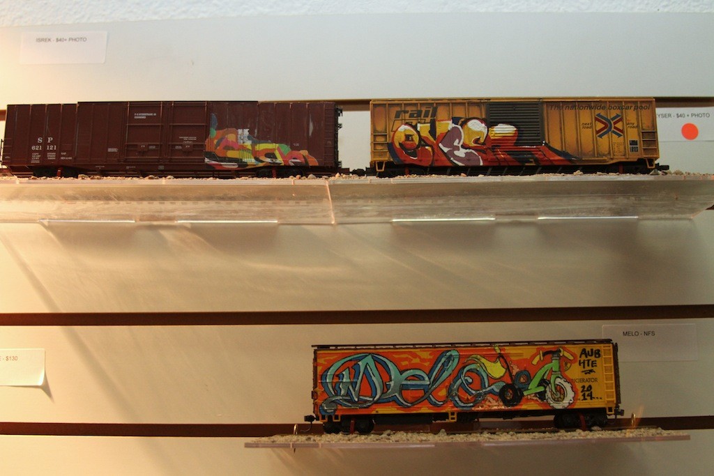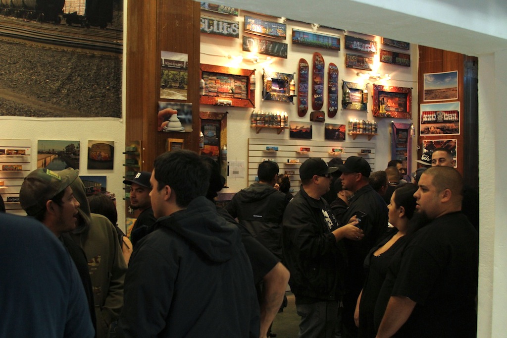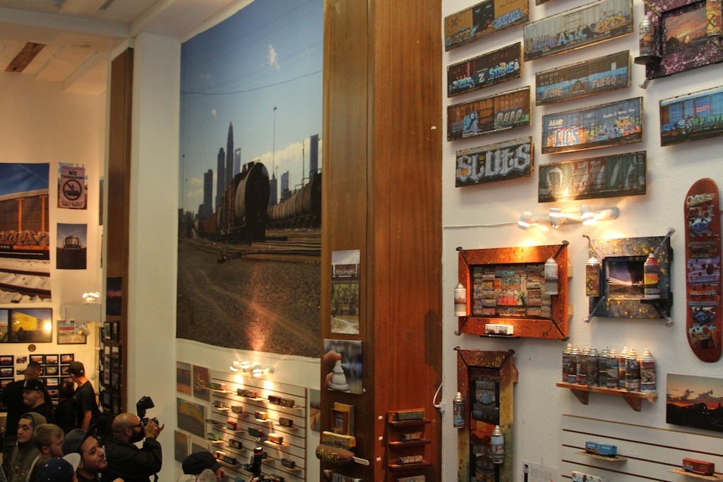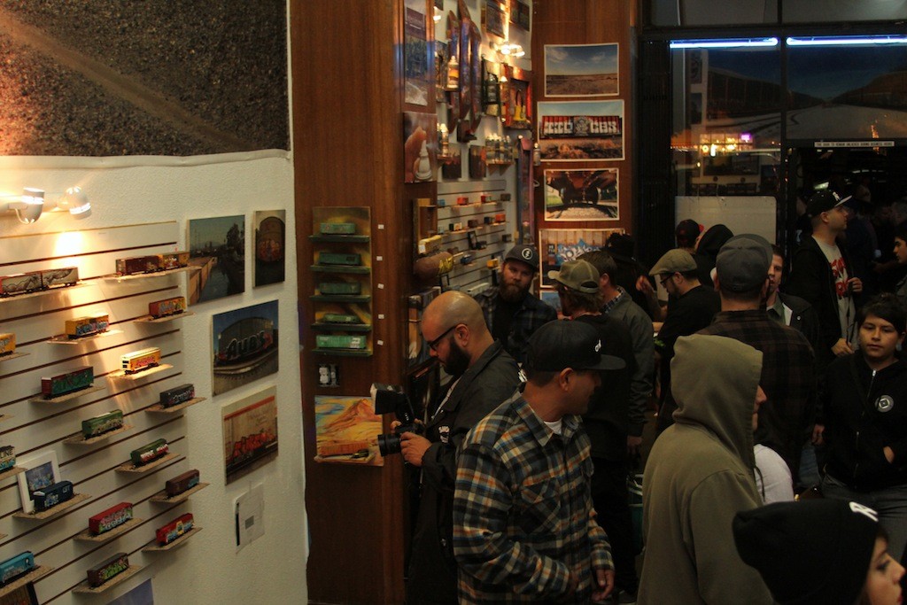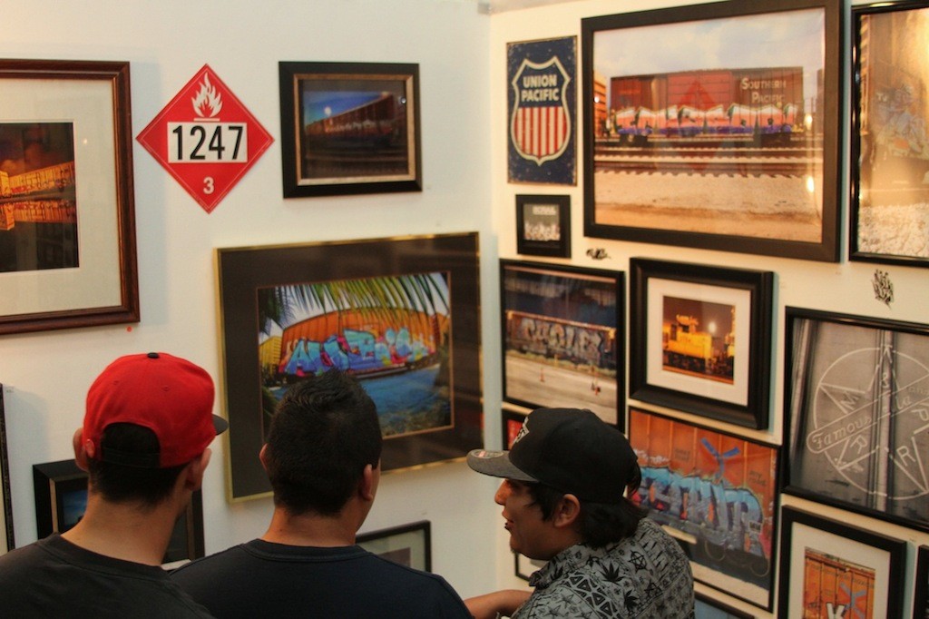 Here’s another flashback for all you art fans. Today we look at the 3rd annual “Steel Giants” Group Freight Train Art Exhibit held at the GCS clothing store in Pomona March 8th, 2014. This is arguably GCS’s Pomona most popular art show. Tons of great art and art fans flood the Con Safos gallery for this show every time they host it. This year’s photographic participants include Eric BMW, True2Death, Bob Ross, REVISE_D, Railside Rebellon, Bob the Bencher, Reefer Sutherland and DCAN. Canvas art by The Savageland, Freight Bandit and Deuce Seven 27.