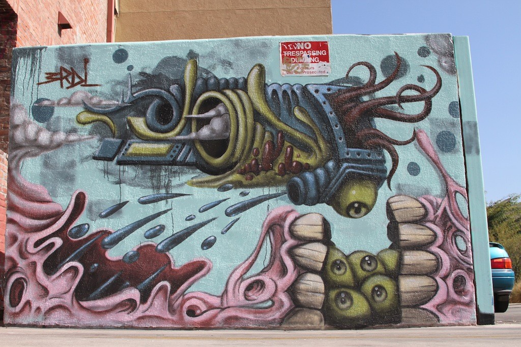 By nature, street art is meant to be temporary. Never lasting too long, if spotted, it should be appreciated, photographed, and remembered. Because the length of it’s existence is always unknown. With that said, we bid a fond farewell to this piece by the artist 3rdi. Painted for his NOV 1st 2014 solo art show at the new GCS Santa Ana entitled “Return to tell the Tale”, this piece has been enjoyed by countless passers-by, urban campers, midnight alley thugs and 4th street shoppers alike.