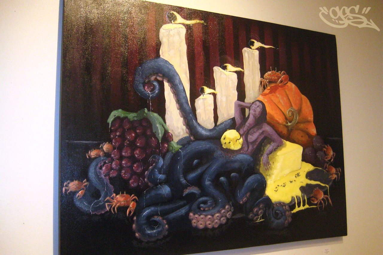 December’s art show brought us Aspeh’s “Within the Core”. This is the third or fourth time that we have had the pleasure of hosting Aseph in our gallery. The crowds were great as usual despite the cold weather. 3rdI, APE, Hurl, and Irene Garcia also displayed newly created pieces in support of the show. The show was predominated by original acrylic paintings, punctuated by Aspeh’s huge centerpiece created on digital media. For more info on Aseph, check out his site www.aspehone.com. Special thanks to Elvis Williams a.k.a. DJ REAL for the great tunes all night long.
