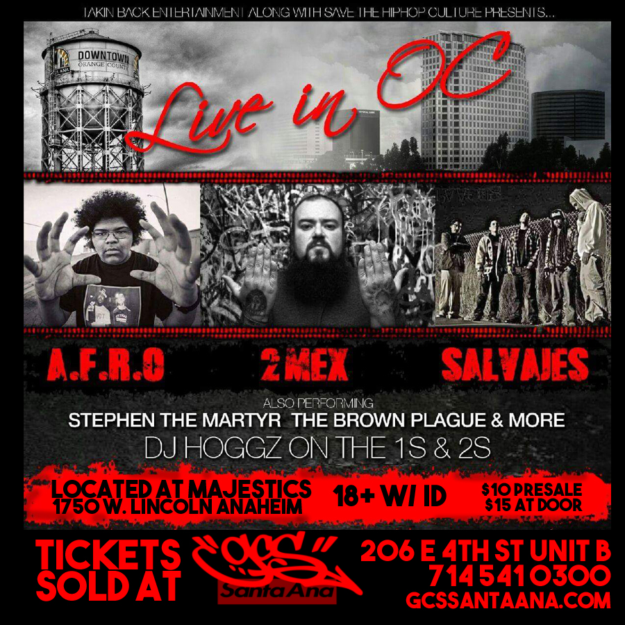 Events, News ‘LIVE in OC’ DEC 19 with A.F.R.O., 2MEX and Salvajes December 14, 2015 Killergreen Leave a comment DEC 19th, 2015- going down at Majestics Mexican Bar and Grill, ‘LIVE IN OC’ looks to be a great hip hop show. Hitting the stage that night will be OC natives A.F.R.O. and Salvajes along with the legendary 2MEX. 18+ to get in, 21+ to drink.