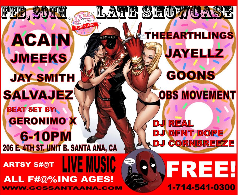 Late Showcase returns to GCS Santa Ana on saturday, Feb 20th, 2016. Featuring performances by Acain, Jmeeks, JAy Smith, Salvajes, THEEARTHLINGS, Jayellz, Goons, OBS Movement. Beat Set by Geronimo X. On the decks DJ REAL, DJ DFNT DOPE and DJ CORNBREEZE. AS always, free and all ages. Come and enjoy a night of beats and rhymes. 6pm – 10pm.