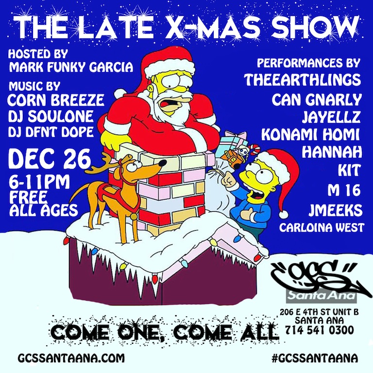 latexmas_3DEC 26th, 2015- It was the day after Christmas and all through the hood… not a creature or crackhead was stirring… well, it was something like the well known poem about Christmas and enjoying the night. GCS was happy to host an in store performance curated by our good friend Mark ‘Funky’ Garcia. “The Late X-MAs Show” brought out the likes of Theearthlings, Hannah, Can Gnarly, Jayellz, KIT, Konami Homi, M16 and Jmeeks. DJ’s for the night were Corn Breeze, DJ SOULONE and DJ DFNT DOPE. Here’s a little photo re-cap of the night, enjoy!Thelatexmasshow_hiphop_gcs_2