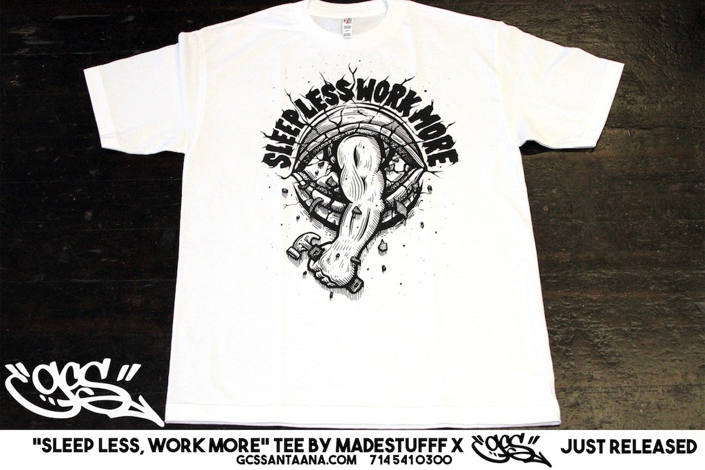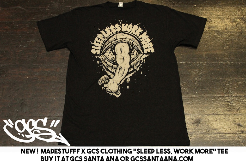 Introducing… “Sleep Less, Work More” Tee by GCS Clothing x MADESTUFF. Released in conjunction with Made Rindu’s solo art show here in our gallery OCT 24th, 2015. Produced 3 ways, in black on a soft feel tee with discharge print. On a AAA white tee and a white soft feel tee. Each version is crisp and clean. Enjoy.