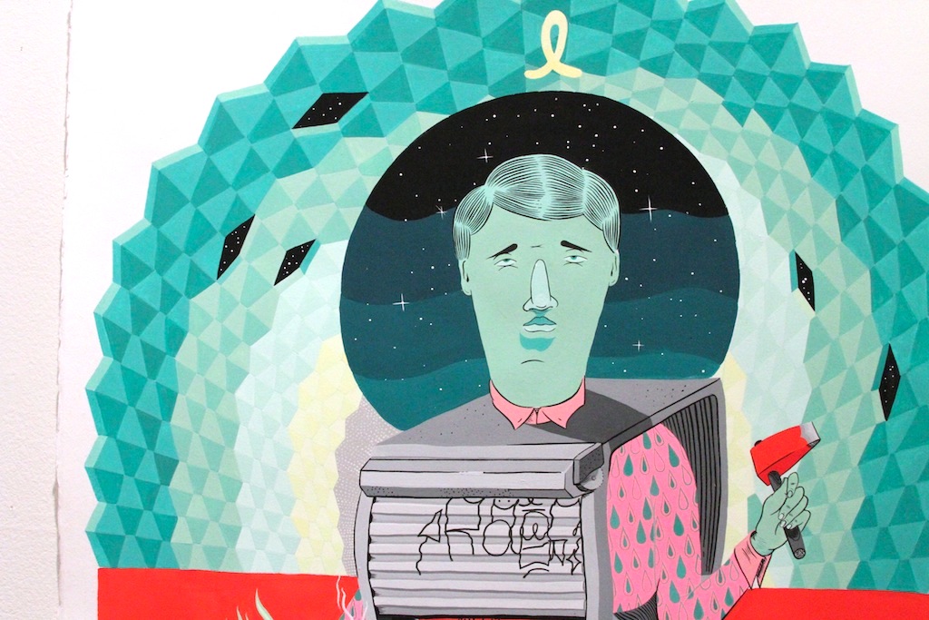 Today we look back at an art show that we hosted in our broadway gallery last year with RAOS. The title of the show was The RAOSSANCE / Don’t Look, Don’t Touch. This was a great solo show for this artist, which combined original canvas paintings, ink and mixed media illustrations, wooden sculpture and a cardboard coffin installation. The colors were bright, the imagery unique and the execution was on point. We need more RAOS in our gallery.