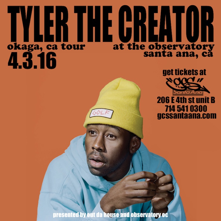 Events, News Tyler The Creator at The Observatory April 3rd March 31, 2016 Killergreen Leave a comment Tyler The Creator comes to The Observatory Sunday April 3rd and GCS Santa Ana has tickets to see the show. Call us at 714 541 0300 for info, but do not sleep on getting these tickets.